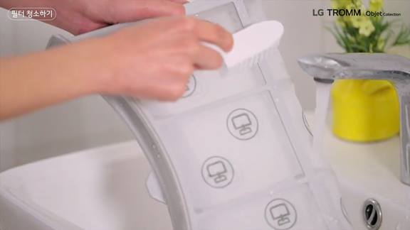 먼지 필터를 건조기에서 분리시키기 전 필터 주변에 보풀이나 먼지가 있다면 물티슈 또는 청소기로 제거해 줍니다. 필터를 건조기에서 꺼낸 후 내외부 필터를 분리하여 솔로 보풀을 털어냅니다. 그런 후 청소기 또는 흐르는 물로 깨끗이 씻어 줍니다. 먼지필터를 말릴 때는 필터를 분리 후 통풍이 잘되는 곳에 세워 충분히 말려주고 다 말린 필터는 건조기에 설치해 줍니다.